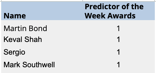 - Antonia Williamson & Charlie Barnish – Final note this week goes to Antonia and Charlie who were the only predictors to score any points in the Chelsea v Nott’m Forest game, both backing forest to a surprising away win.