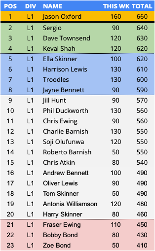 - In form predictor (3 week avg) – New- 1st Week – Harrison Lewis – 126.7 points per game over a rolling 3 week period. PLPL Average over 3 weeks = 90 PPG