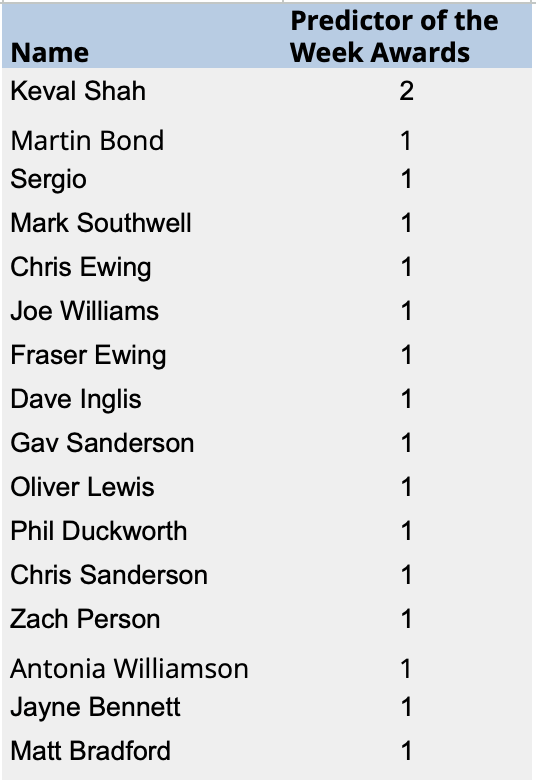 Predictor of the week with 120 Points / 64 points above the average / First ever PotW award.