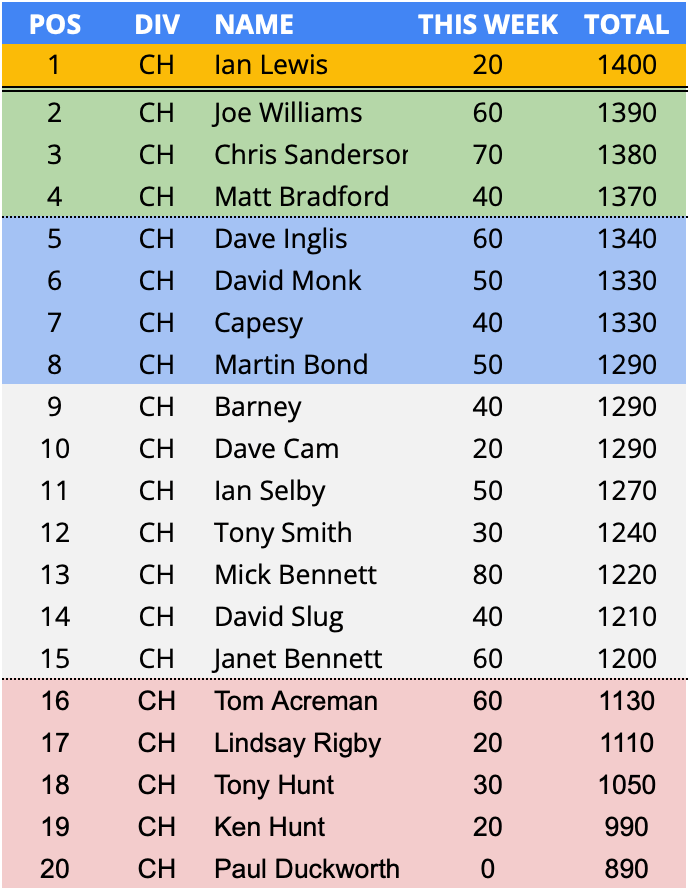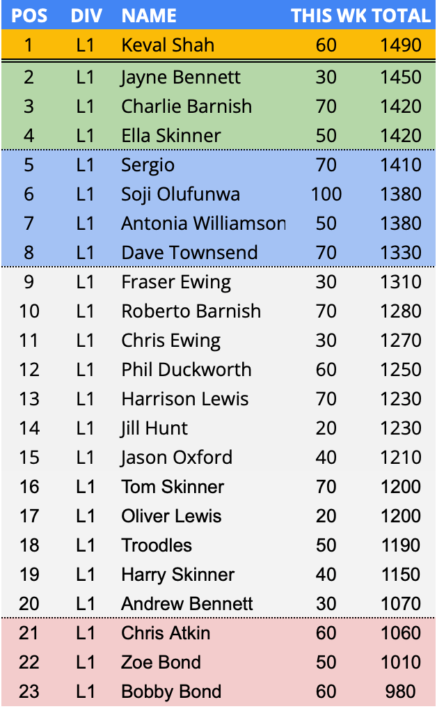 - Weekly Average PLPL Score – 53 Points – Second lowest of the season
