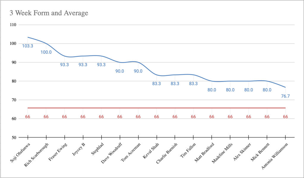 - In form predictor (3 week avg) – New – 1st Week – Soji Olufunwa – 103.3 points per game over a rolling 3 week period.