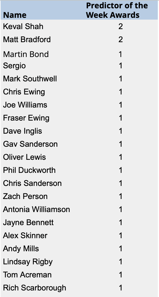 - Lowest Scoring Fixture of the Round – Brighton v Burnley.