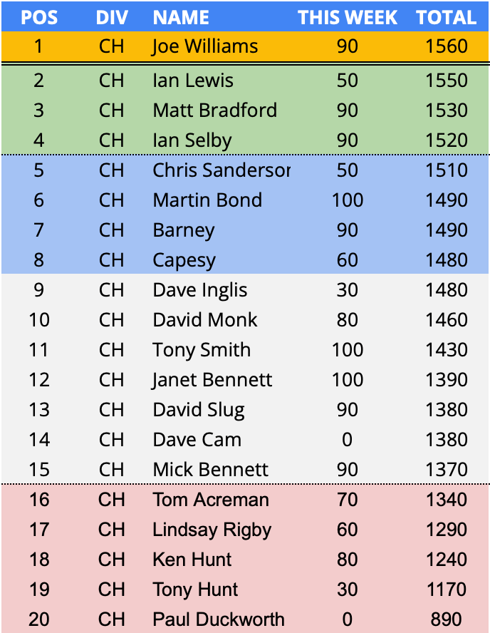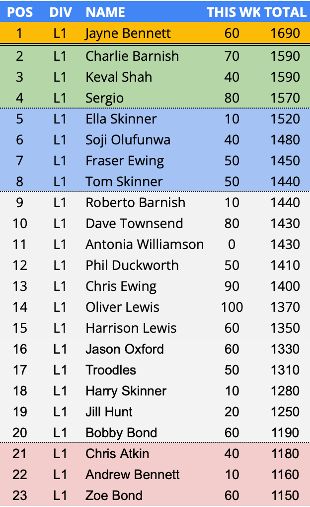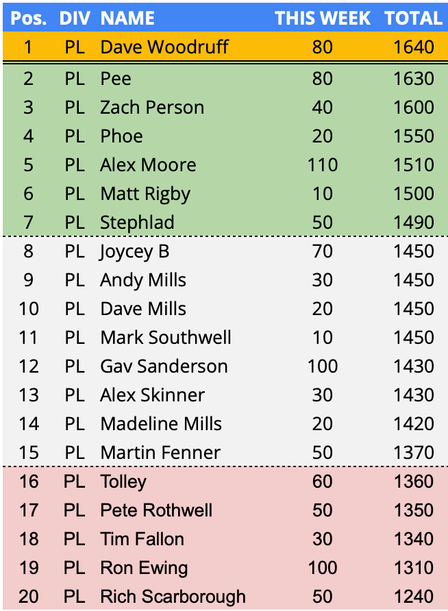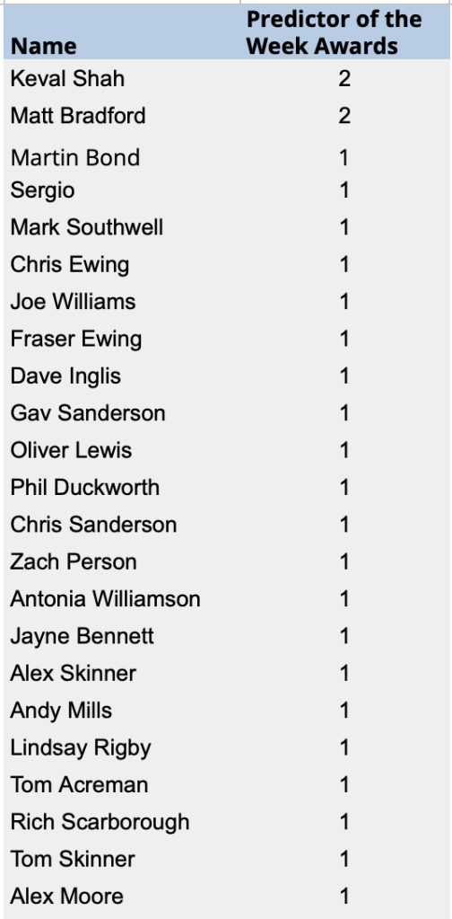- In form predictor (3 week avg) – New – 1st Week – Tom Skinner – 103.3 points per game over a rolling 3 week period.