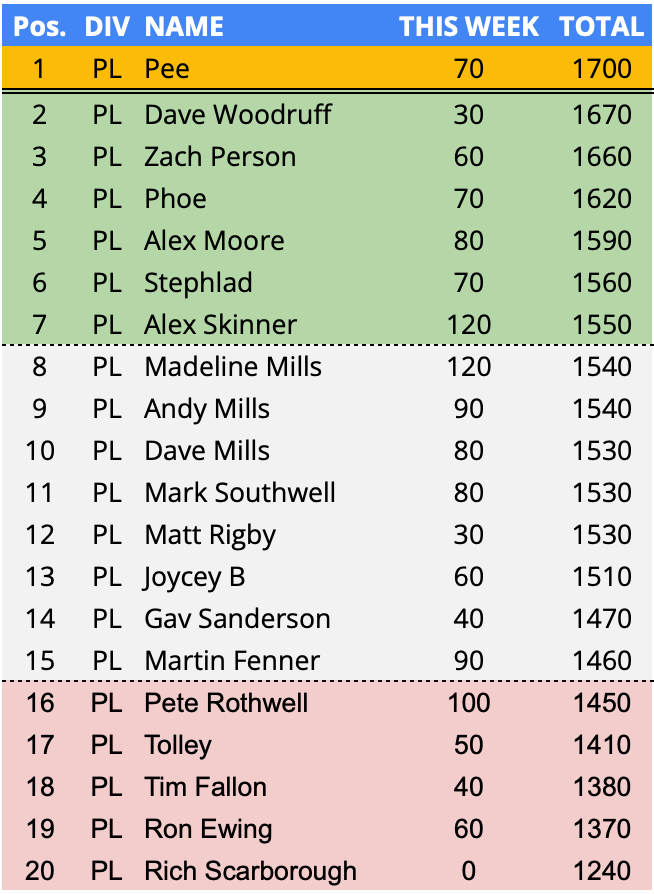 - Weekly Average PLPL Score – 67 Points