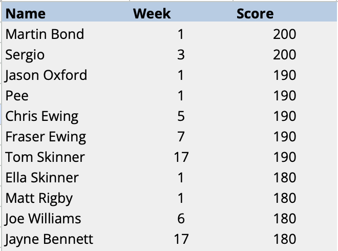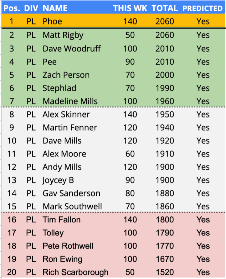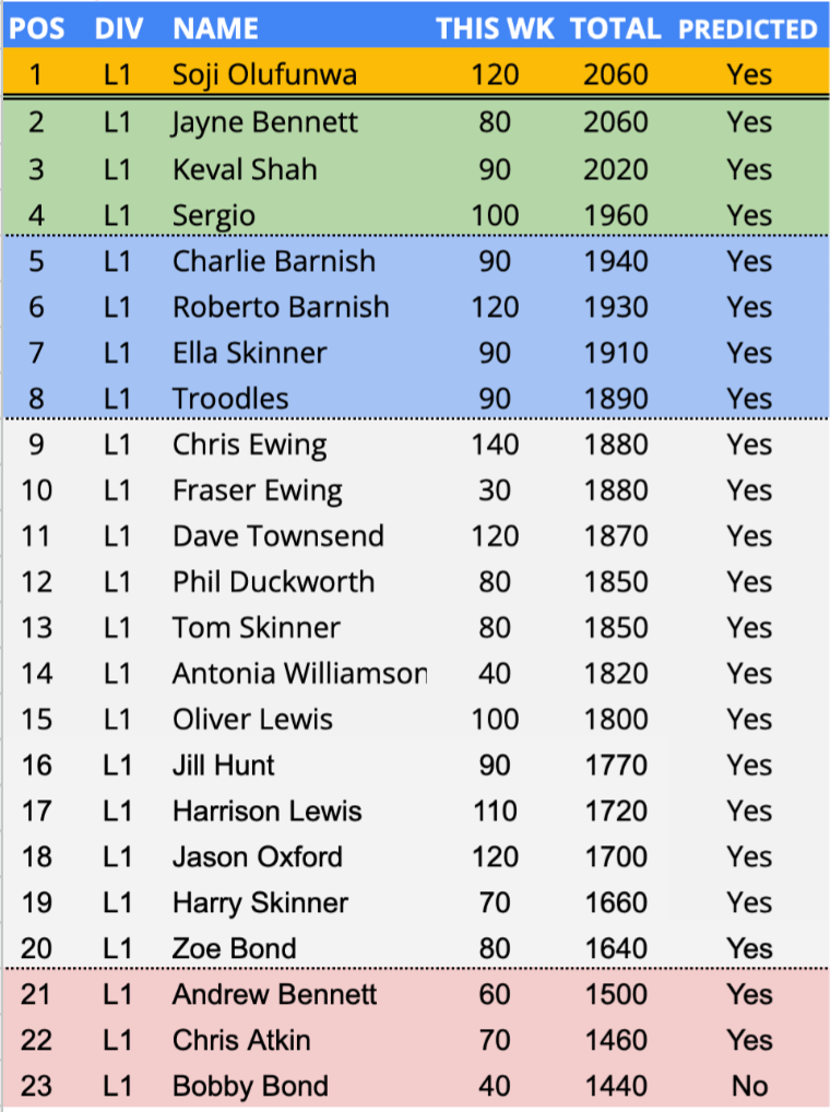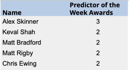 - In form predictor (3 week avg) – 2nd Week – Soji Olufunwa – 133.3 points per game over a rolling 3 week period.