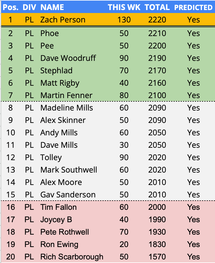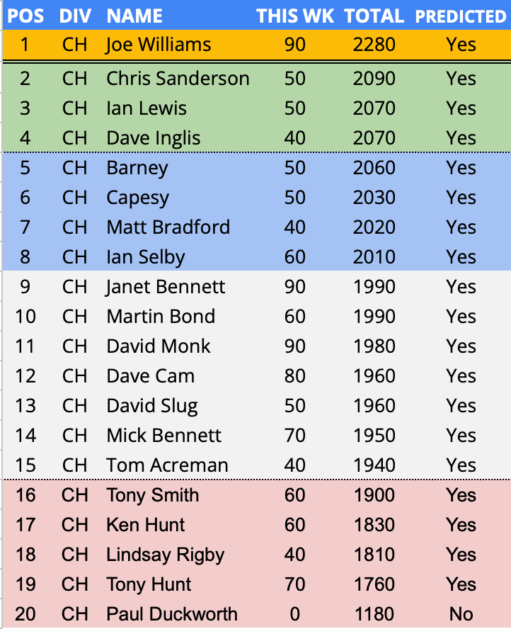 - In form predictor (3 week avg) – 2nd Week – Chris Ewing – 136.7 points per game over a rolling 3 week period.