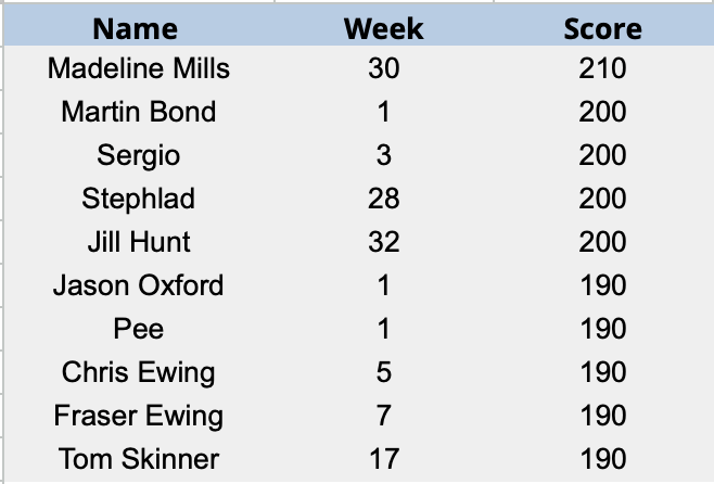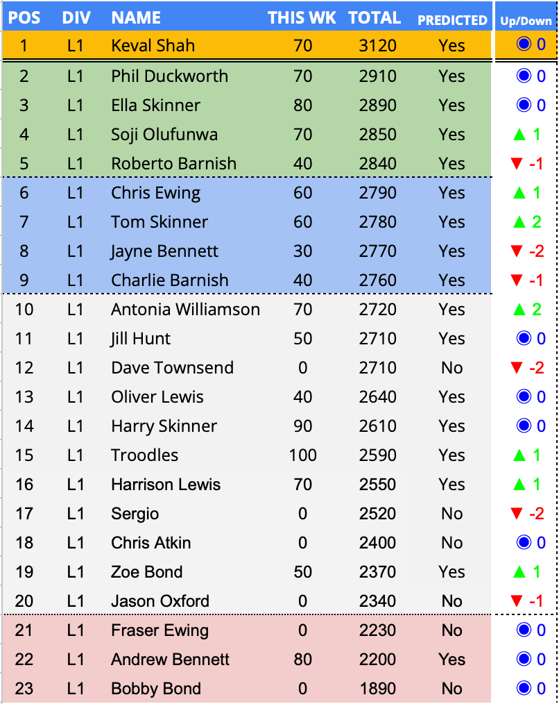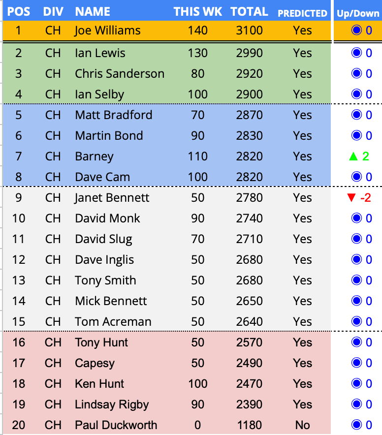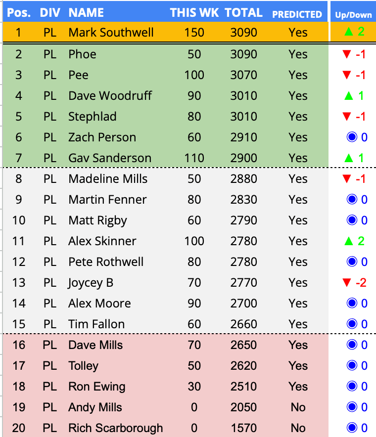 - In form predictor (3 week avg) – 1st Week – Mark Southwell – 123.3 points per game over a rolling 3 week period.