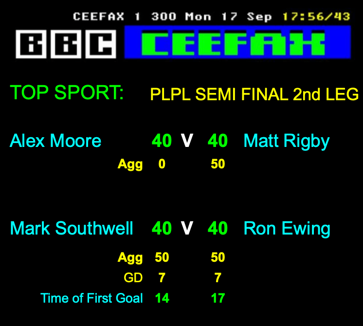 - For the second round running, Nothing to separate Mark Southwell and Ron Ewing as they managed to predict the similar results. Tying on Aggregate across the two legs they also had the exact same goal difference across the 4 ties……Which took us to the lesser used closest goal decider in the second legs. Ron Ewing seals his passage to a Wembley final courtesy of his 17min first goal predictions which was 3 minutes closer to Mats Hummels 50th minute goal in the PSG v Dortmund second leg.