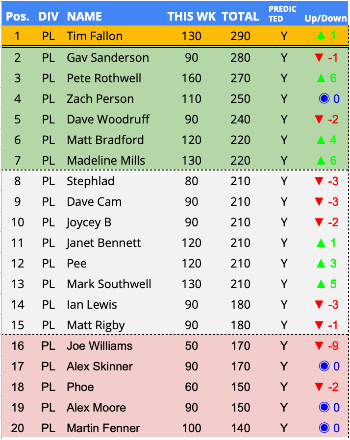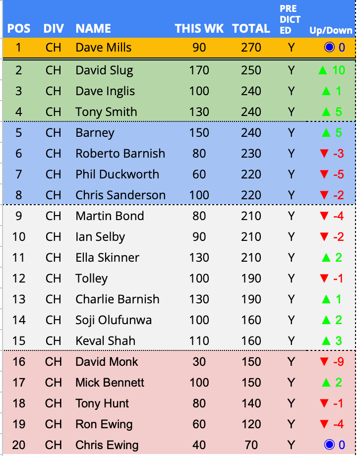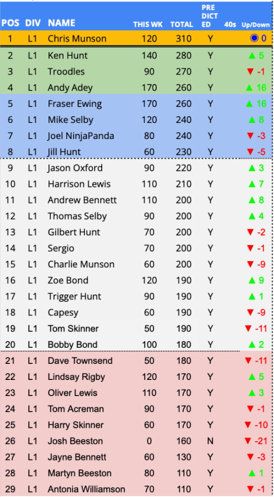- In form predictor (3 week avg) – 1st Week – Chris Munson – 155 points per week over a rolling 3 week period