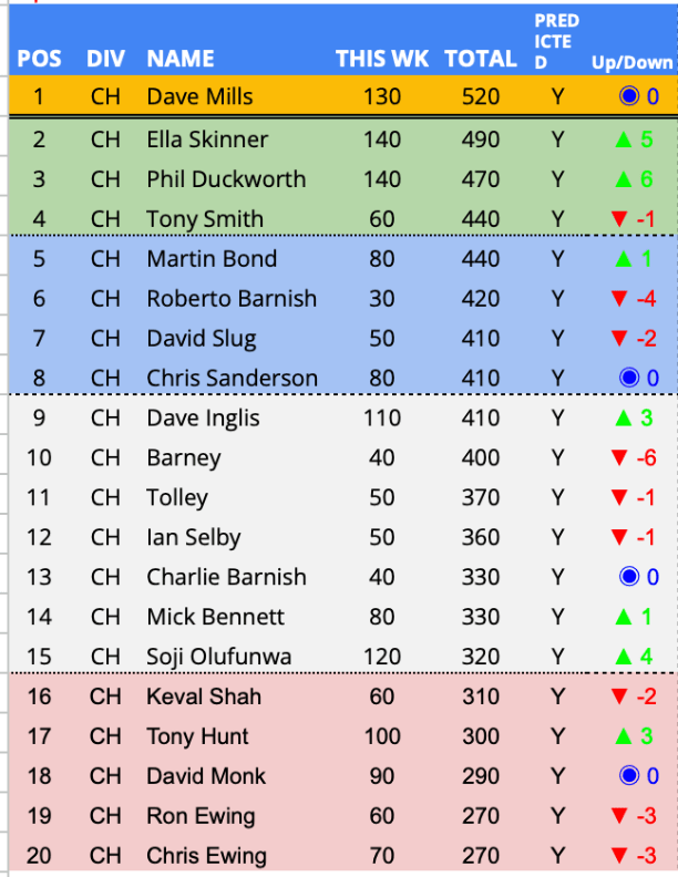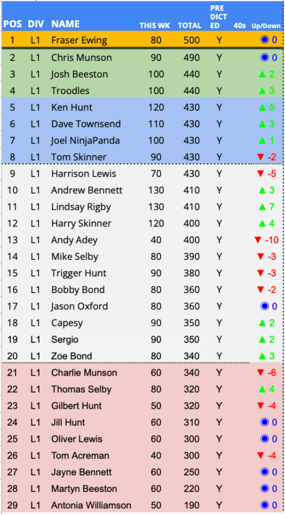 - Ella Skinner– The only unique prediction of the round came from the daughter of a forest fan (who might I add predicted a Liverpool win). Ella the only predictor in the PLPL to back forest to win at Anfield collecting a unique 10 points.