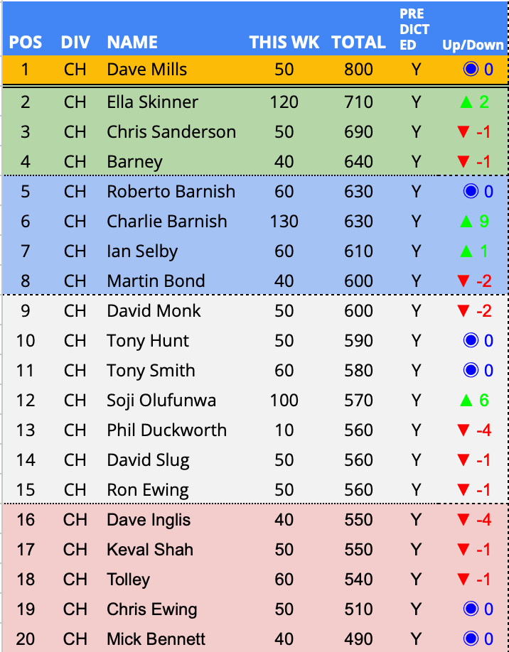 - In form predictor (3 week avg) – New – 1st Week – Joe Williams – 110 points per week over a rolling 3 week period