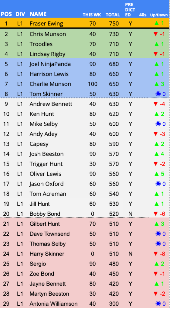 - Weekly Average PLPL Score – 56 Points (lowest of the season)