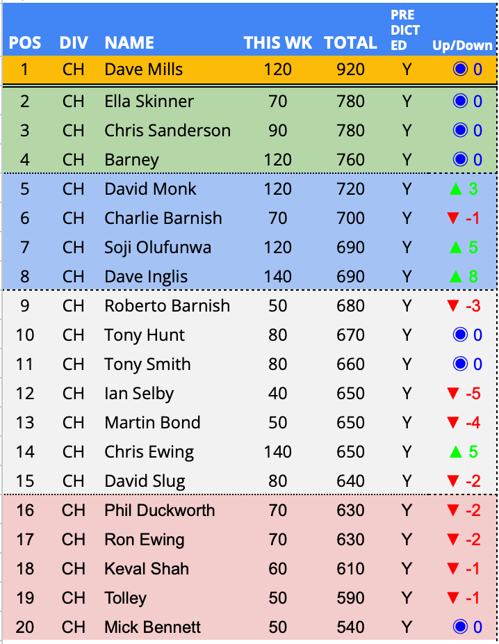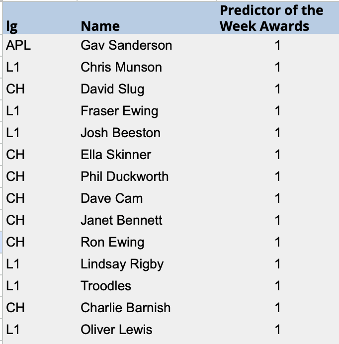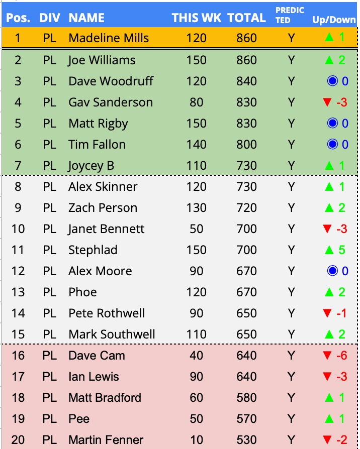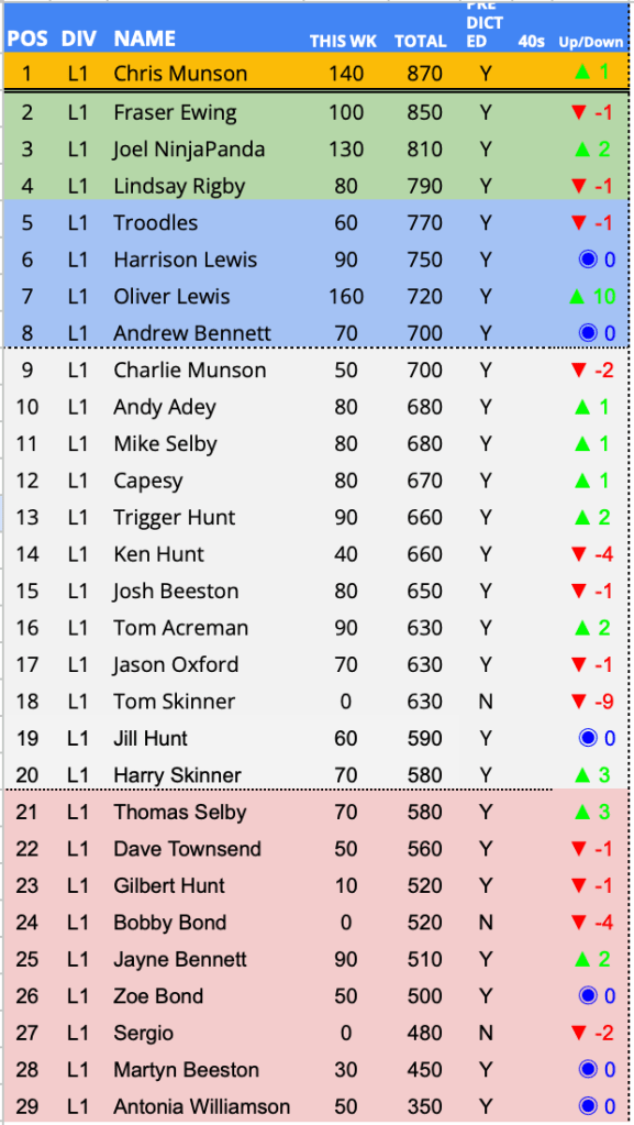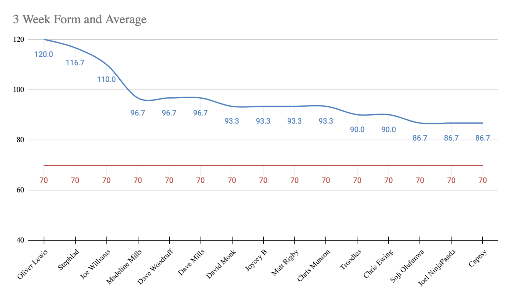 - In form predictor (3 week avg) – New – 1st Week – Oliver Lewis – 120 points per week over a rolling 3 week period