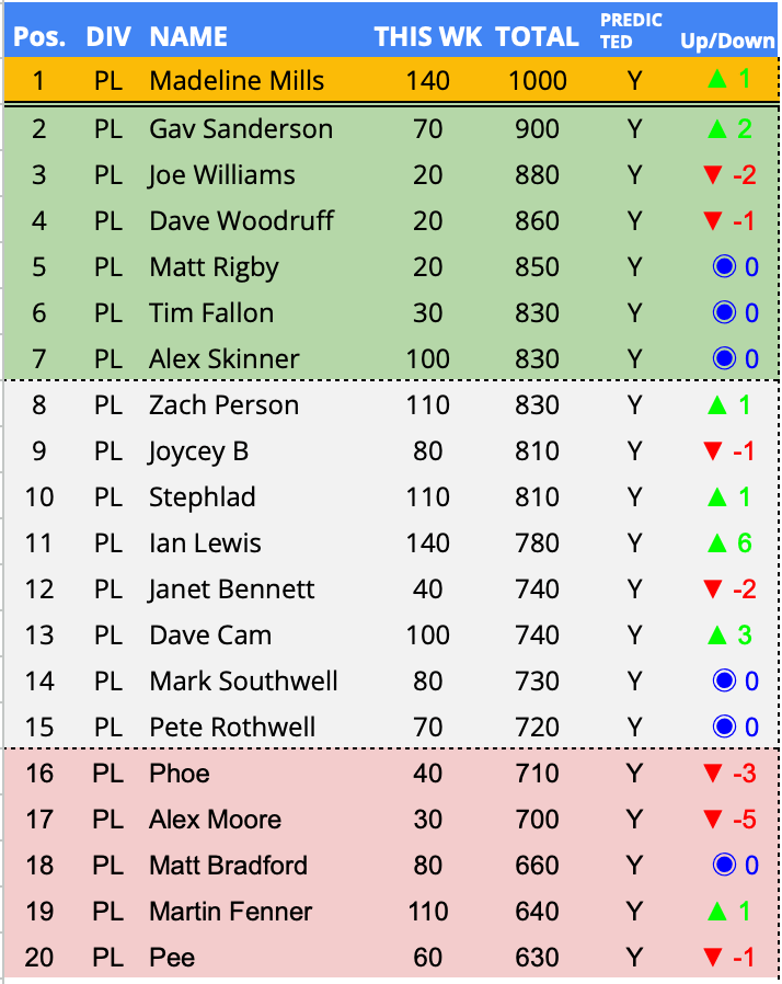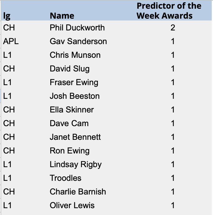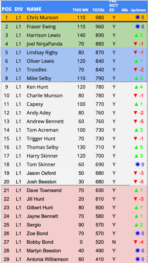 - In form predictor (3 week avg) – 2nd Week – Oliver Lewis – 123.3 points per week over a rolling 3 week period