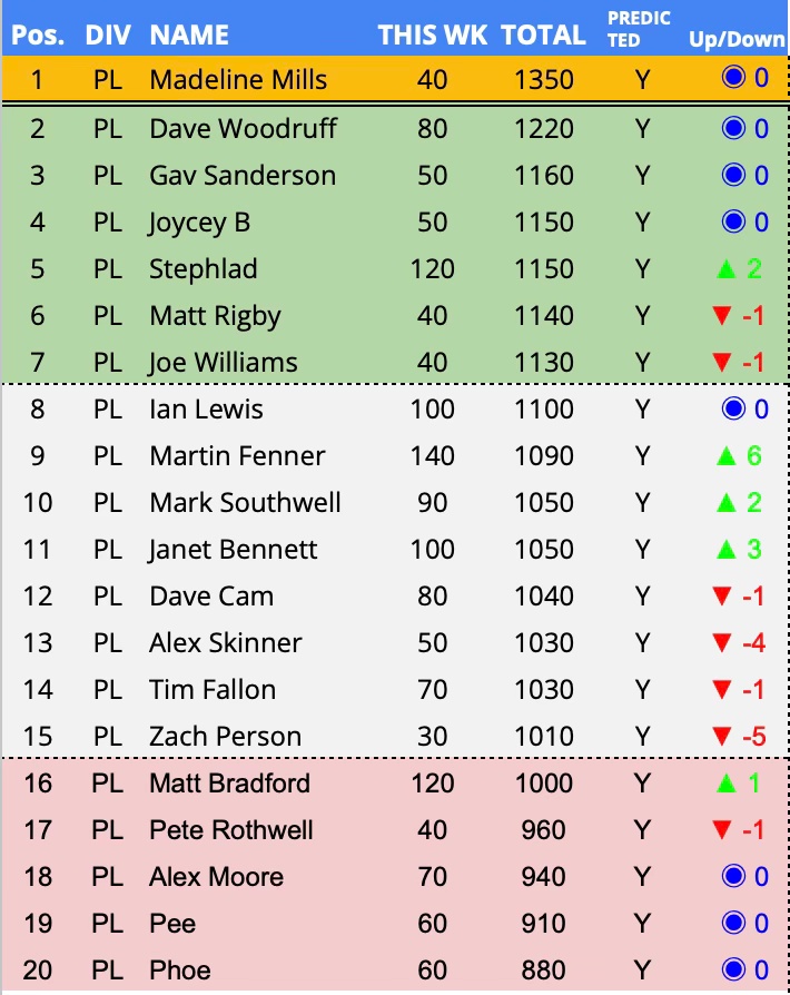 Predictor(s) of the week with 140 Points / 67 points above the average / Second PotW award in three weeks.