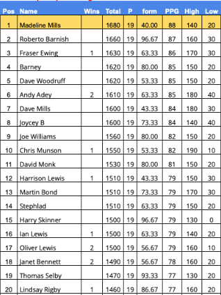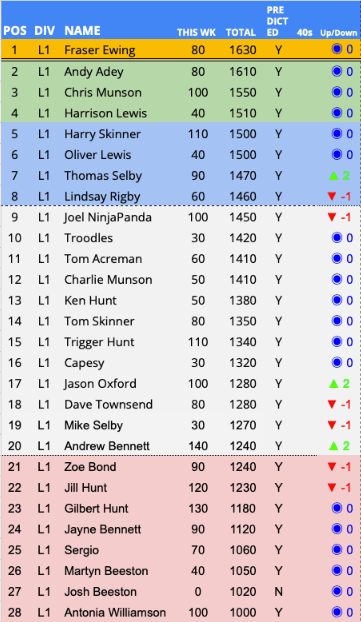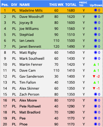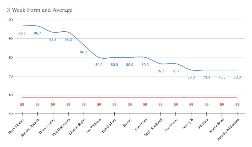 - In form predictor (3 week avg) – 2nd Week – Harry Skinner – 96.7 points per week over a rolling 3 week period