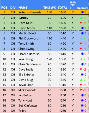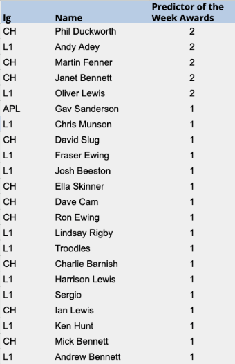 - Ella Skinner and Tony Hunt – No unique predictions this week but honourable mention for Ella and Tony who scored the 20 points from the Ipswich Chelsea game, backing Ipswich to win at Portman road, their first premier league home win in 22 years!