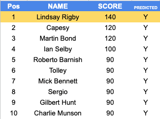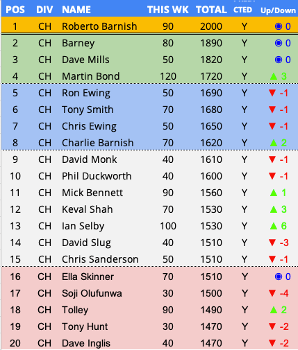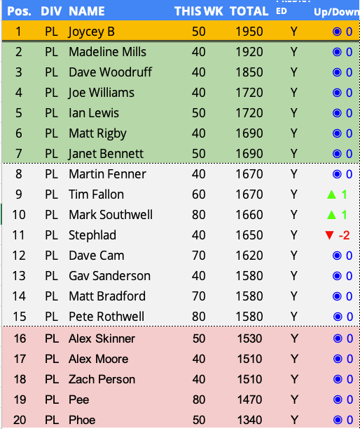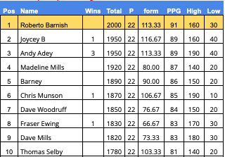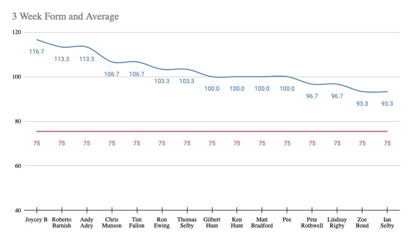 - In form predictor (3 week avg) – New – 1st Week – Joyce Barnish – 116.7 points per week over a rolling 3 week period