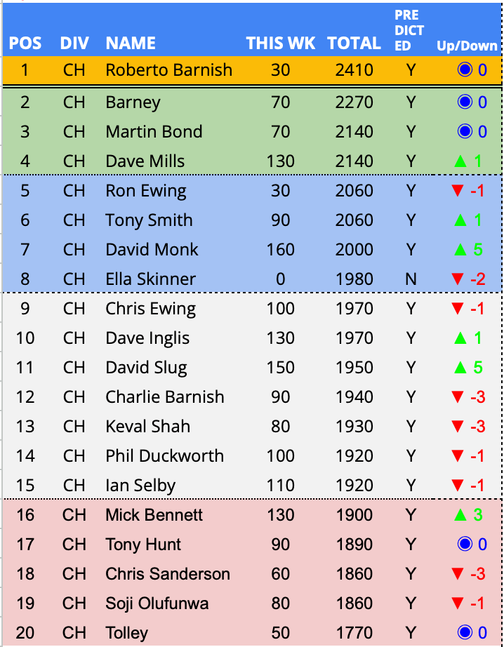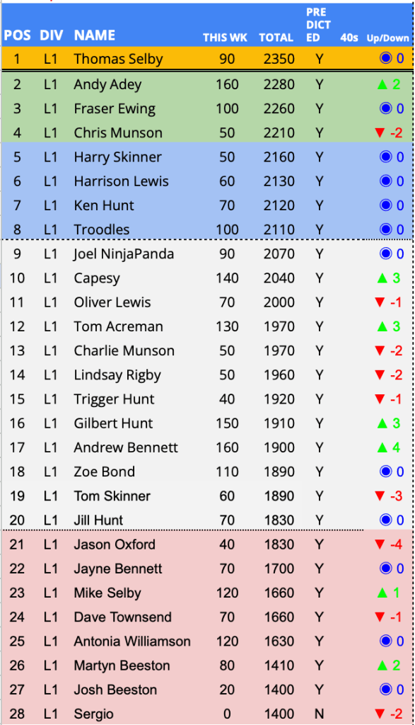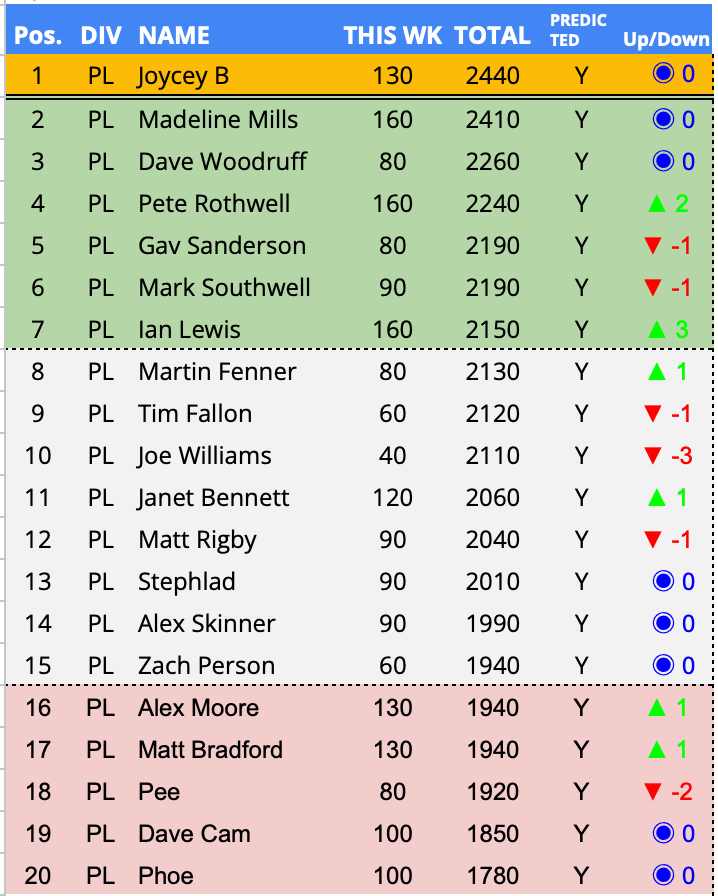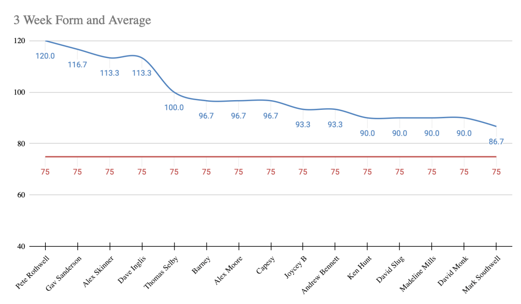 - In form predictor (3 week avg) – New – 1st Week – Pete Rothwell – 120 points per week over a rolling 3 week period