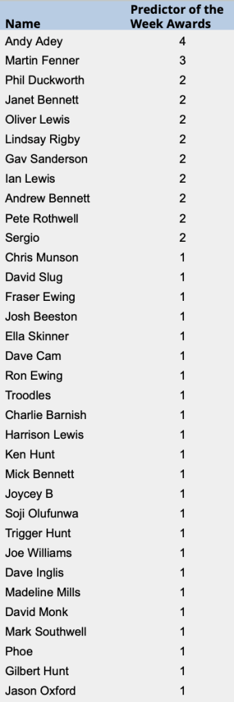 - Jill Hunt – Picked up the only points from the Bournemouth v Ipswich game , backing Ipswich to win away despite only picking up 2 points from the last 10 games in 2025.