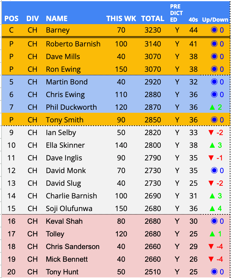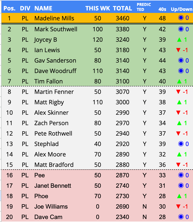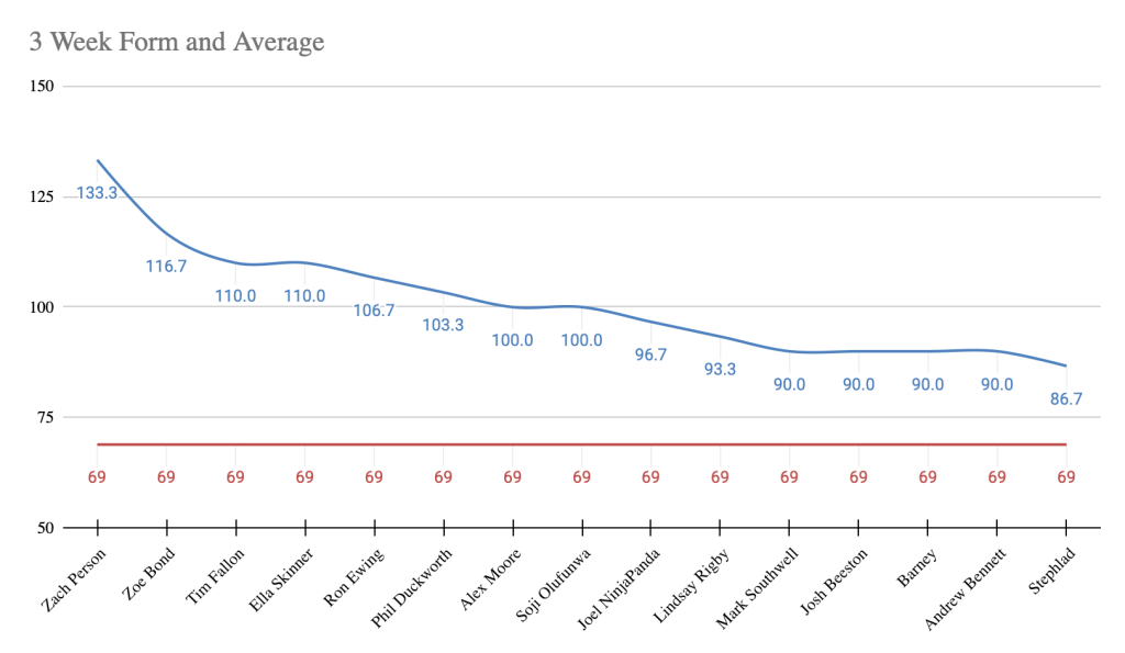 - In form predictor (3 week avg) – 2nd Week – Zach Person – 133.3 points per week over a rolling 3 week period