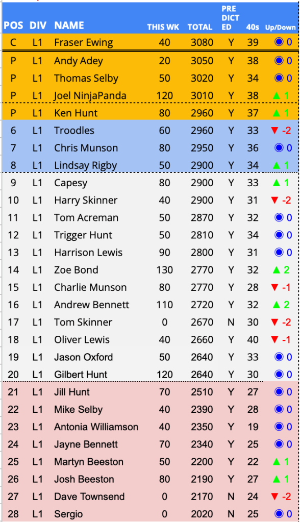 Predictor(s) of the week with 150 Points / 82 points above the average / Ron retained his place in the Championship automatic places. Soji, having spent 14 weeks in the relegation zone performed a last day survival act jumping 7 places to 15th.