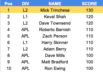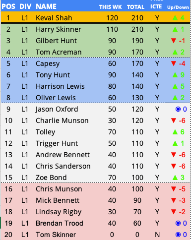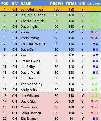 Predictor(s) of the week with 130 points / 41 points above the average. Mick’s debut season in the PLPL and he gets a PotW at the second time of asking and straight to the top of the League Two Table.
