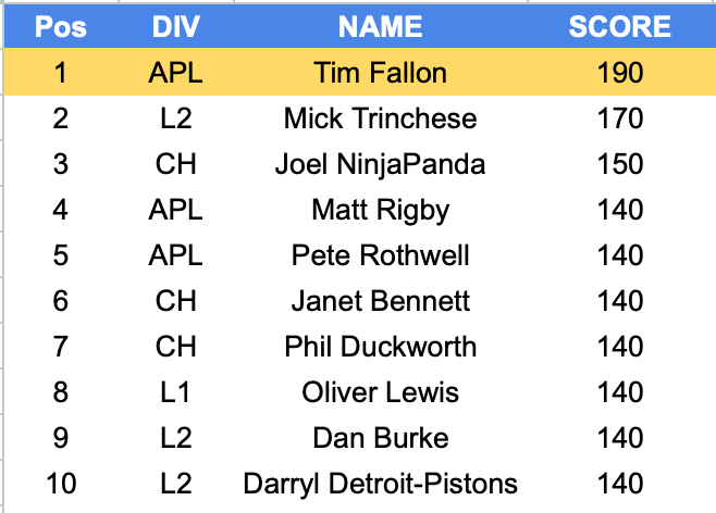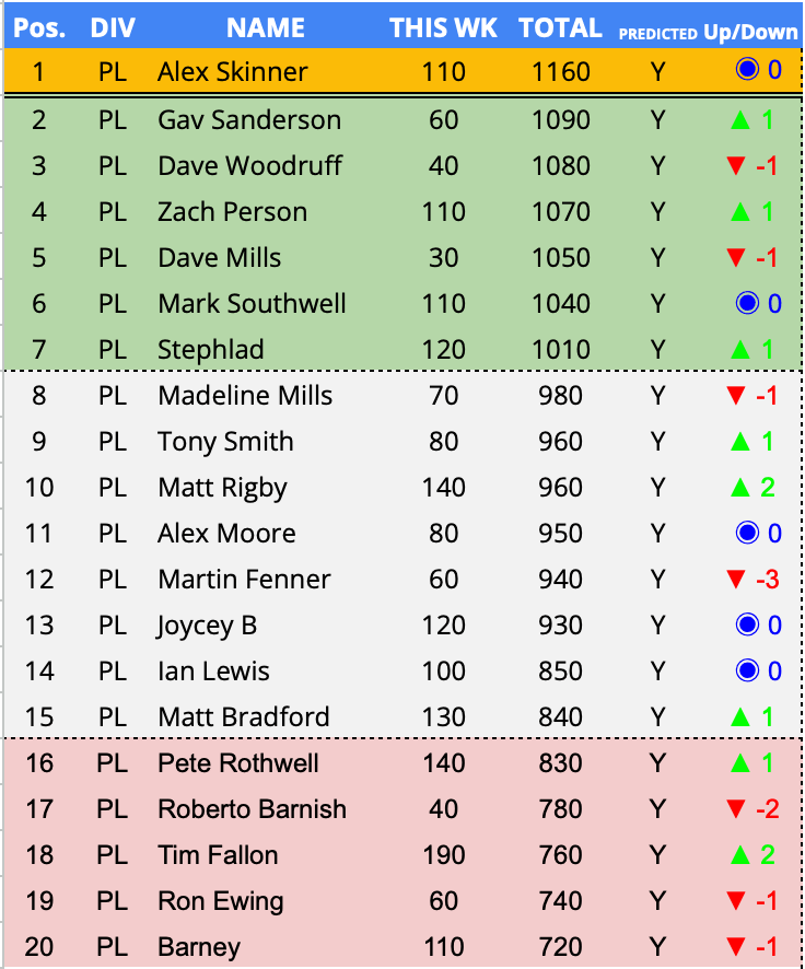 - Tim Fallon – Liverpool v Nott’m Forest – Liverpools slump continues but on Tim from the PLPL predicted a Forest win collecting the sole 10 points from the fixture on his way to predictor of the week.