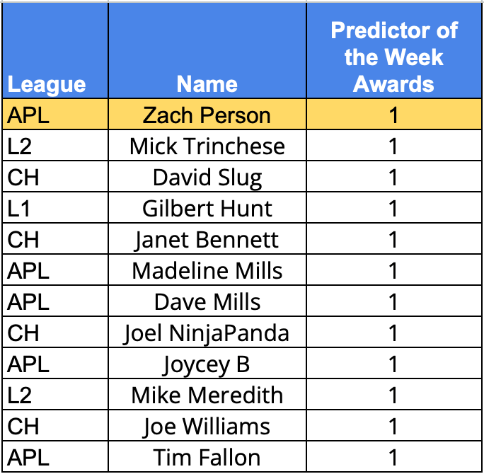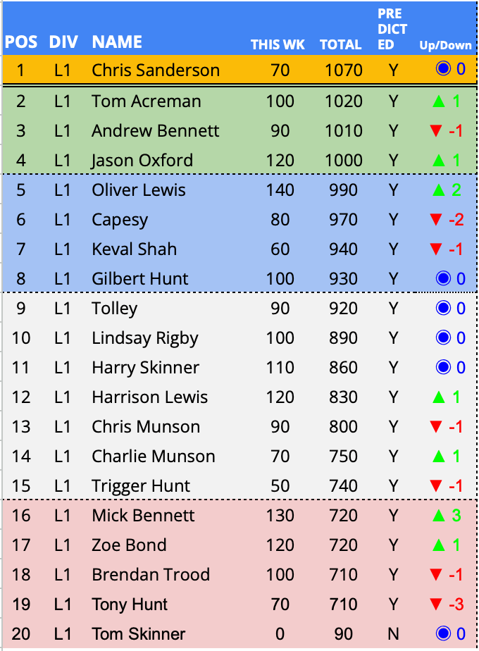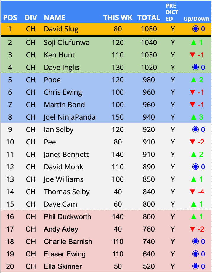 Predictor(s) of the week with 190 points / 98 points above the average. Tim jumps up two places to 18th in the premier league after recording the 4th highest score of the season, which included a unique prediction.