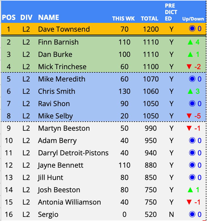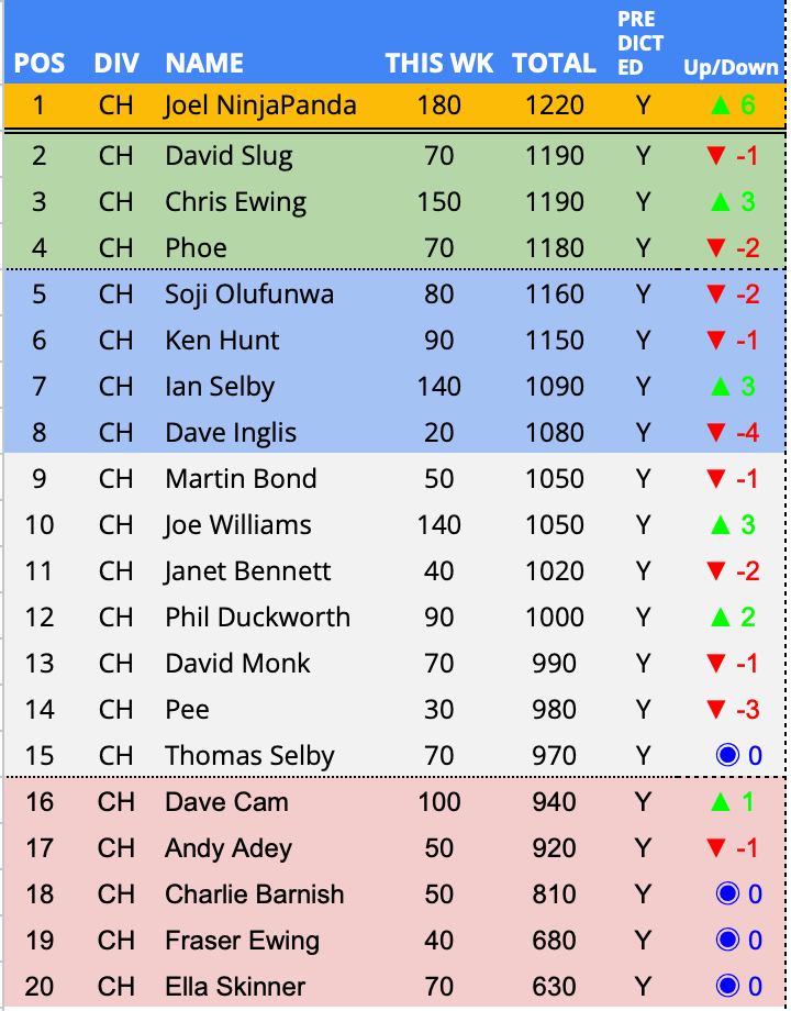 Predictor(s) of the week with 180 points / 111 points above the average. Joel becomes the first double predictor of the week winner this season, in doing so becomes the in form predictor over the last three weeks and to top it all off, moved to the top of the Championship. What a week!