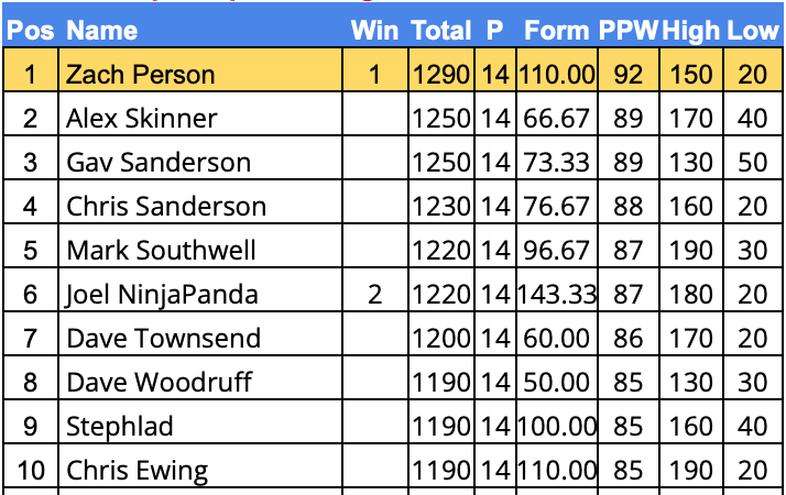 - PPW – Average points per week over the season