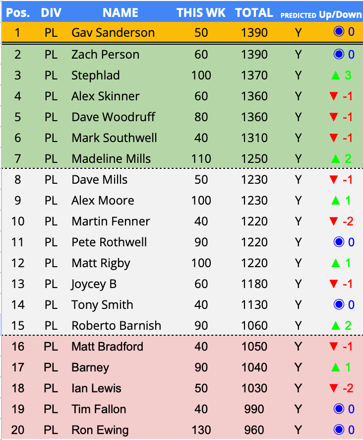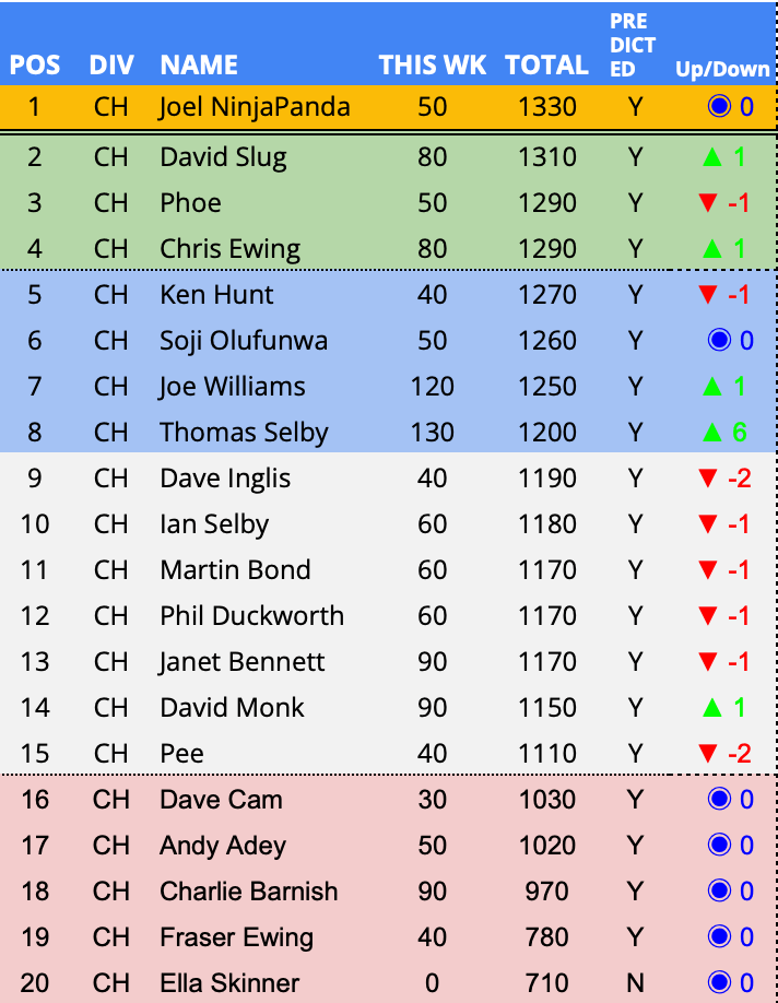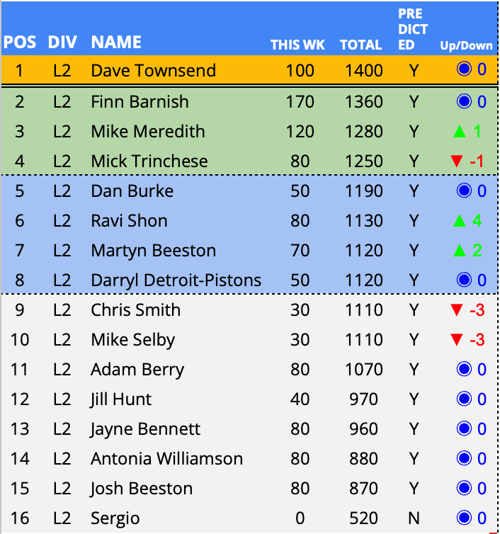 Predictor(s) of the week with 170 points / 103 points above the average. A new PLPL record broken, our new youngest ever predictor of the week. Finn predicting 2-0 or 3-0 wins pays off this weekend with a 170 points and moves up to second place in League Two.