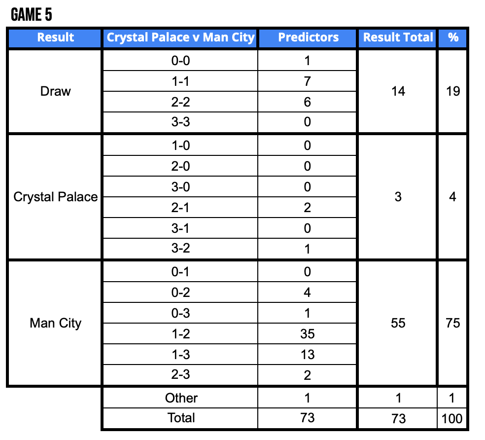 - Ron Ewing – Crystal Palace v Man City (0-3). Man City have now won their last four league games by netting at least three times in each.