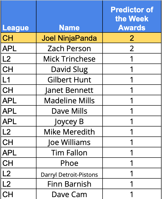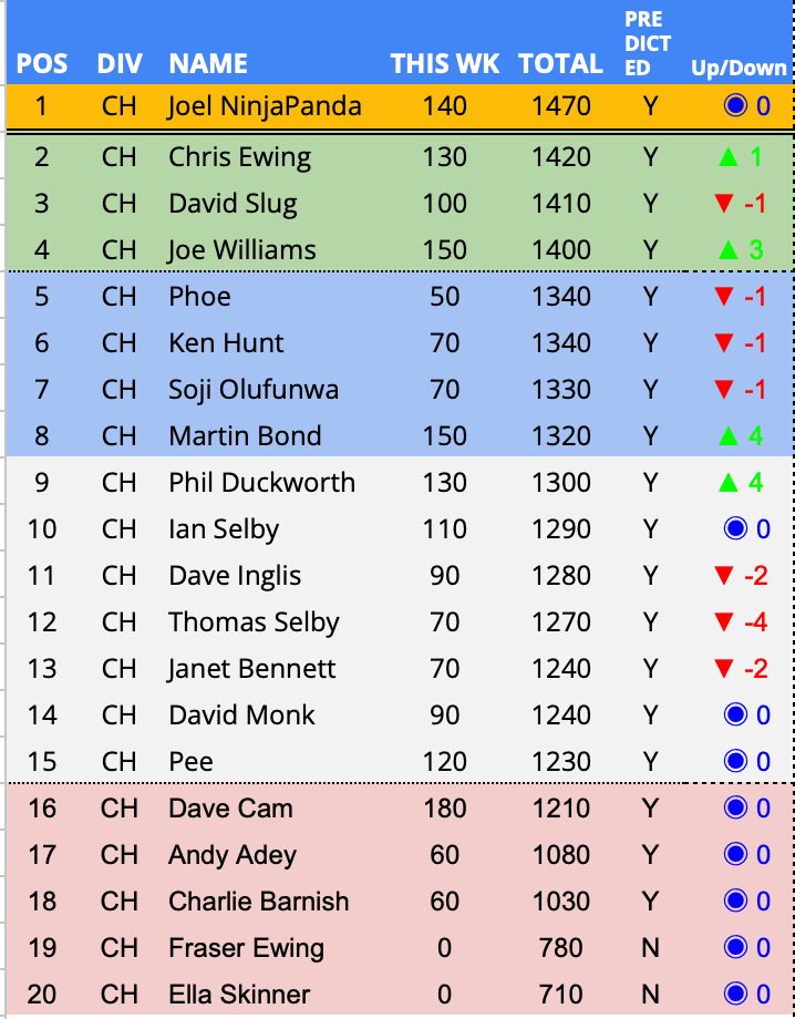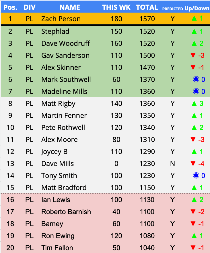 Predictor(s) of the week with 180 points / 83 points above the average. Zach takes control of the Premier League going into Christmas day and in doing so becomes the highest scoring predictor of the season across the PLPL. Dave records his highest score of the season and moves to just 20 points from safety in the Championship.