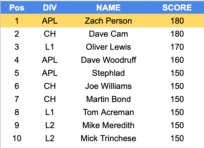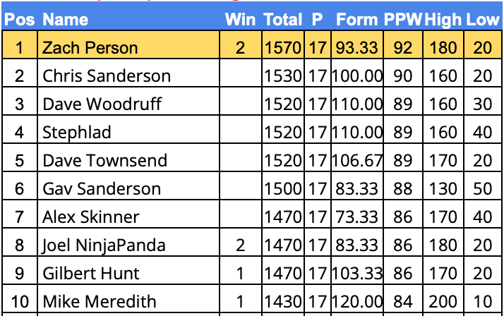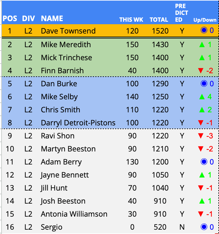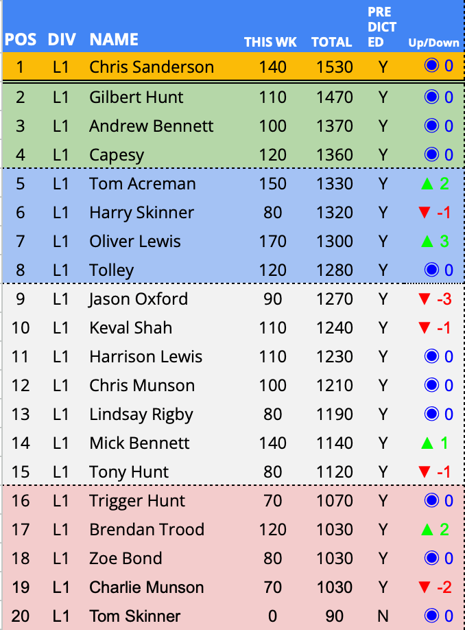 - In Form Predictor (3 Week Average) – New – Mike Meredith – 120 Points