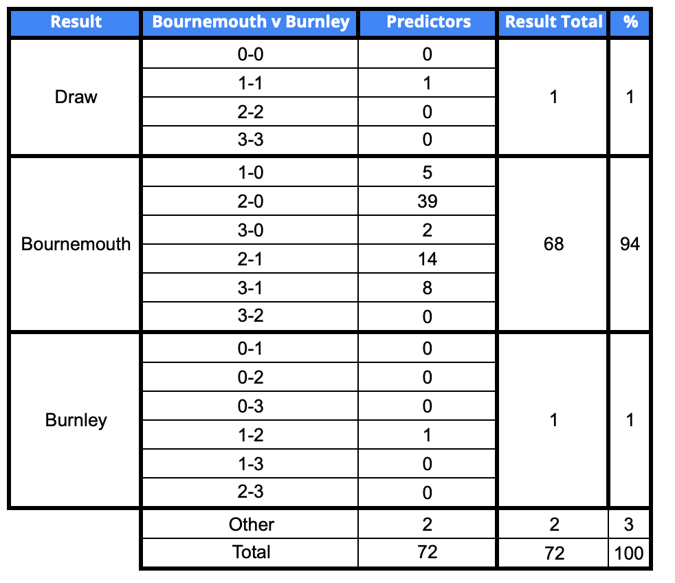- Chris Smith – Bournemouth v Burnley (1-1). Only predictor backed Burnley to win, 68 for a Bournemouth win and Chris the only predictor to go for a 1-1 maximum 40 point draw. Burnley ended their 7 game losing streak in this game.