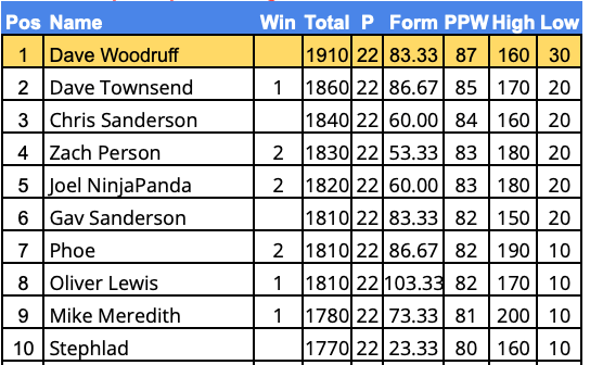 - In Form Predictor (3 Week Average) – New – Dave Mills – 103.3 Points