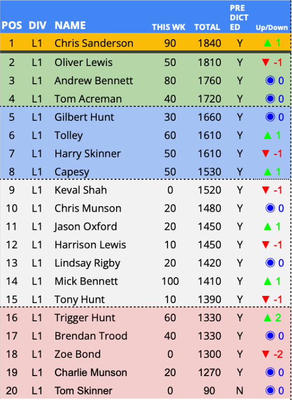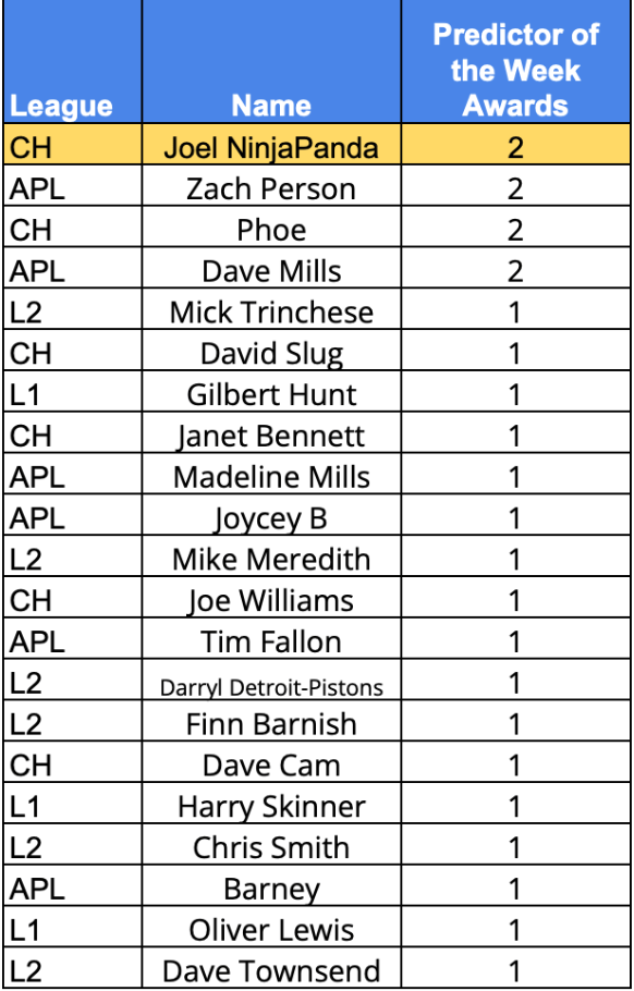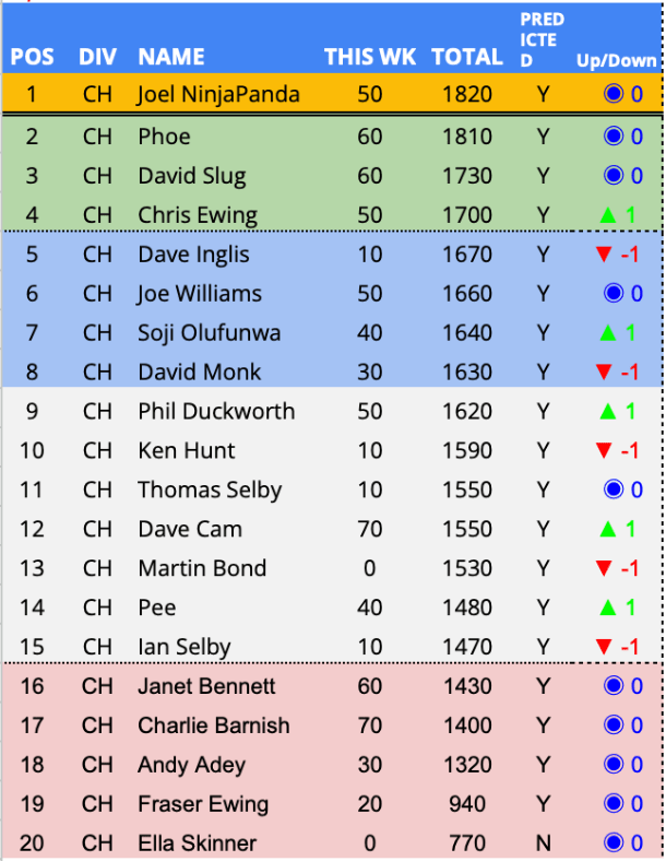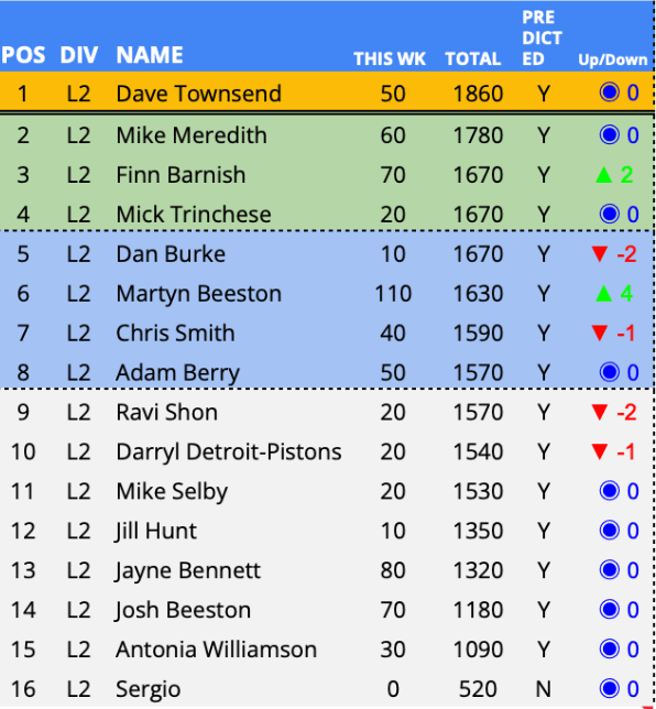 Predictor(s) of the week with 130 points / 91 points above the average. Bagging his second predictor of the week award this season and in such a low scoring round on average moves up a mighty 6 places into the Champions League qualification places.