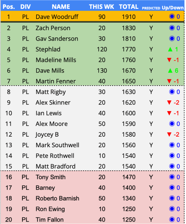 - Weekly Average PLPL Score – 39 Points – Joint Lowest of the Season