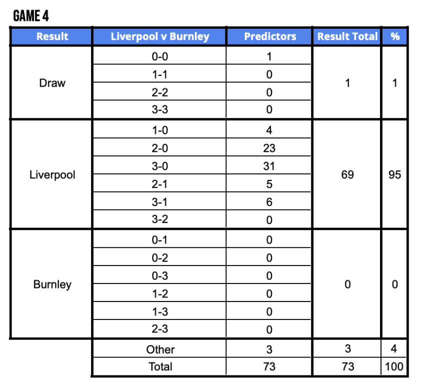 - Chris Smith – Liverpool v Burnley (1-1). 1% (1 in total). The only predictor backing a draw in this fixture despite Burnley being winless in their last 13 games.