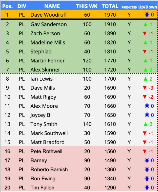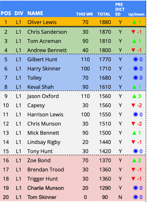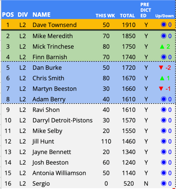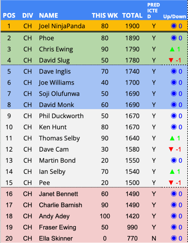 Predictor(s) of the week with 140 points / 81 points above the average. Jumping three places clear of the relegation zone on the back of the only unique prediction in the PLPL this week.