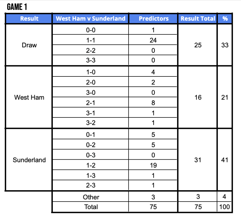 - Tony Smith – West Ham v Sunderland (3-1). 31% (16 in total). Although 16 people predicted West Ham to get their 3rd win a row, Tony was the only predictor backing a 3-1 win.