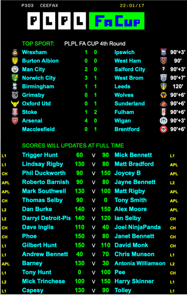 - Gilbert Hunt – Macclesfield v Brentford (0-1) – Macclesfield’s FA Cup dream was dashed when PE teacher Sam Heathcote headed in to his own net. Gilly was the only predictor to backed Brentford to a narrow 0-1 win to gain the only 40 points from the round and in doing so securing safe passage to the 5th round.