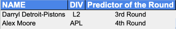 Although 5 predictors scored 150 points in the round, Moore collects the predictor of the round based on lowest goal Difference with 150 Points (Goal Difference of 13) / 52 points above the average / First PotR of the season awarded