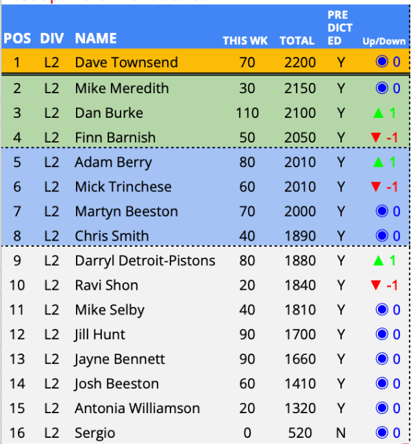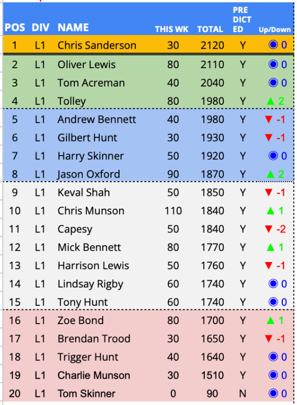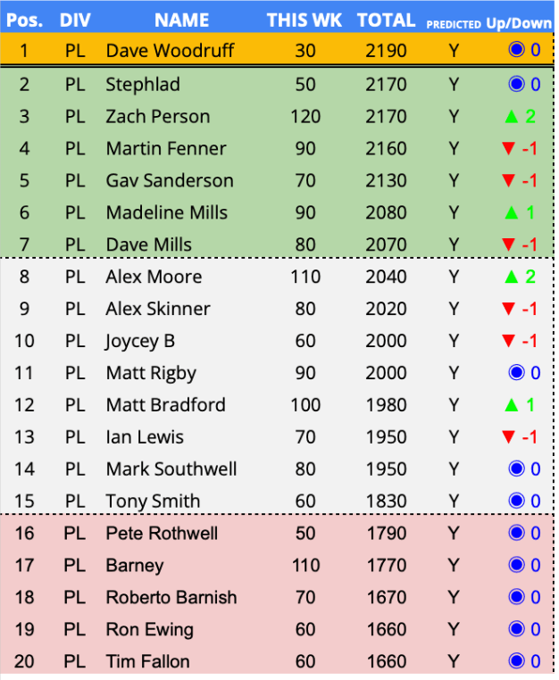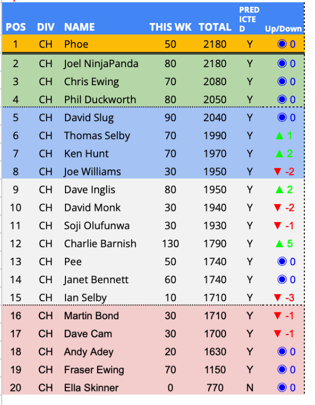 Predictor(s) of the week with 130 points / 69 points above the average. Having been in the Championship relegation zone since week 5, a change of fortunes and a a first predictor of the week award sees CharBar move up 5 places and out the relegation zone for this first time in 22 weeks.