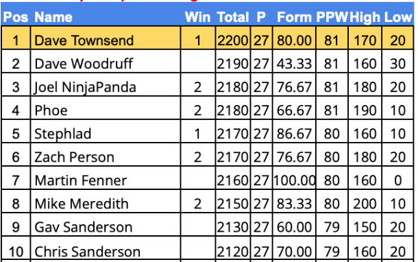 - Weekly Average PLPL Score – 61 Points