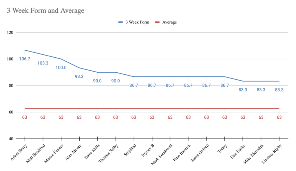 - In Form Predictor (3 Week Average) – 2nd Week – Adam Berry – 106.7 Points