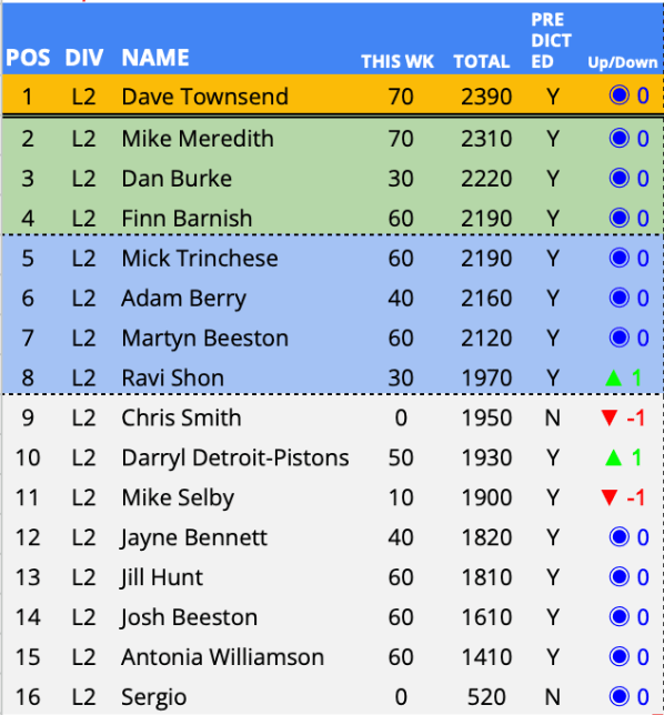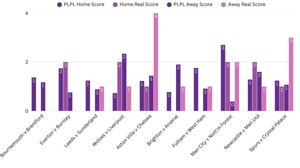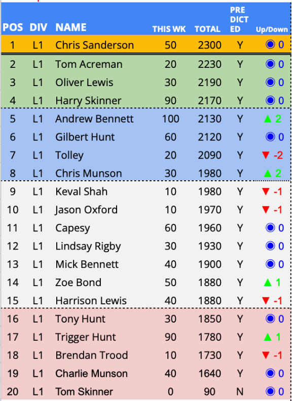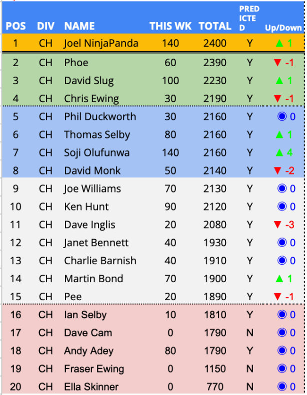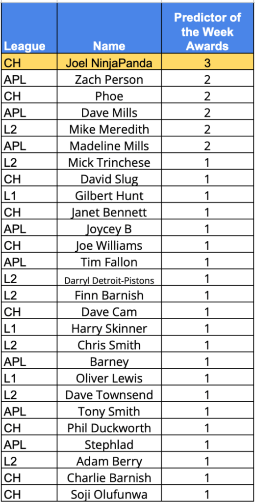 Predictor(s) of the week with 140 points / 95 points above the average. Joels 3rd PotW of the season and in doing so becomes the highest scoring predictor across the PLPL and top of the Championship. A first PotW for Soji but his 140 points and unique prediction moves him up 4 places and in to the Championship playoff places.