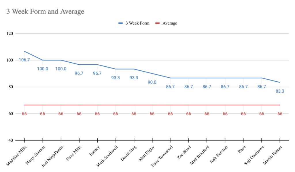 - In Form Predictor (3 Week Average) – New – 2nd Week – Madeline Mills – 106.7 Points