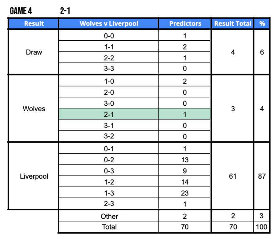 - Soji Olufunwa– Wolves v Liverpool (2-1) . 3 predictors backed Wolves to get their 3rd win of the season but only Soji predicted a 2-1 win in what is the 5th time this season Liverpool have conceded an injury time winner.